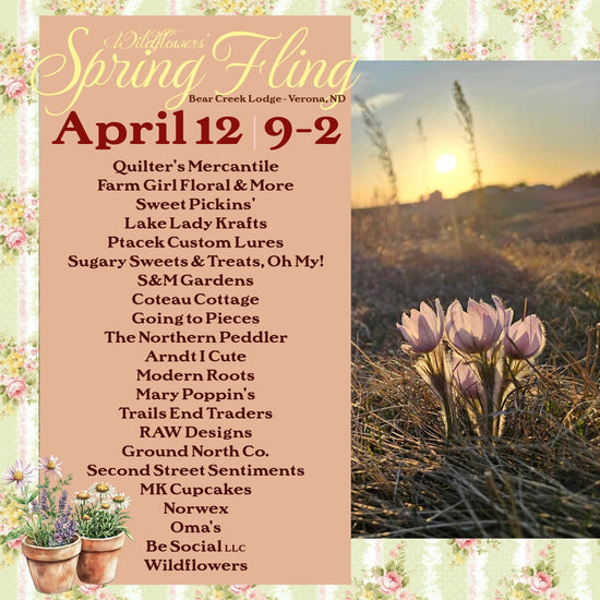 Spring has sprung, which means Wildflower’s Spring Fling Market is here! A full-scale event with something for everyone! Shop for you, your home, or those one-of-a-kind gifts for Mother's Day, Easter, and Graduation. Find everything from makers, bakers, painters, quilters, peddlers, boutiques, & more! Let’s kickoff Spring with some fun at the Bear Creek Lodge & Event Center in Verona, ND. Come shop, have some fun, and celebrate Spring!