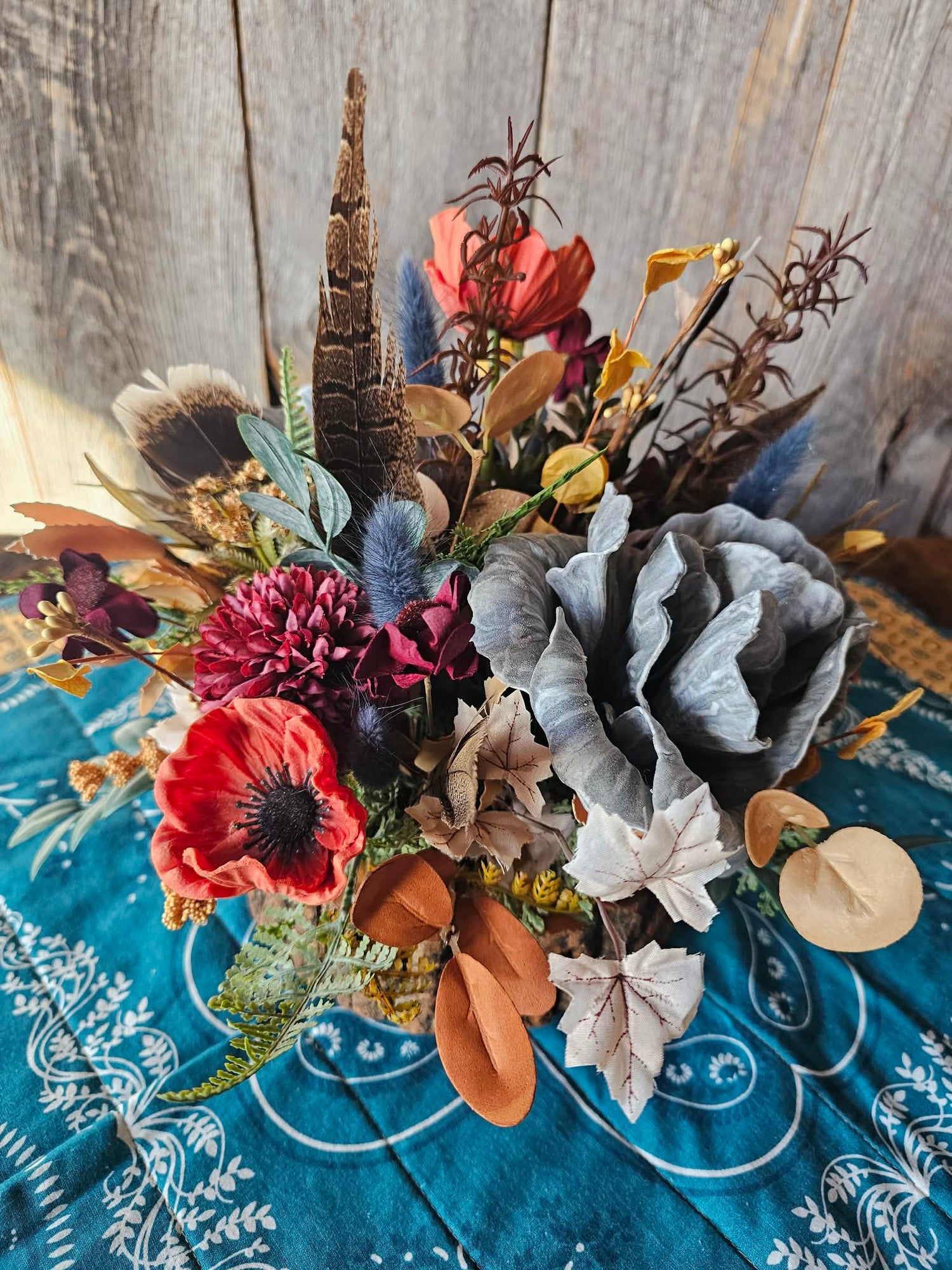 This nutcracker dish is wood and looks like bark - I love finding these. Filled it with feathers and pops of color that feel wintery but not dull.