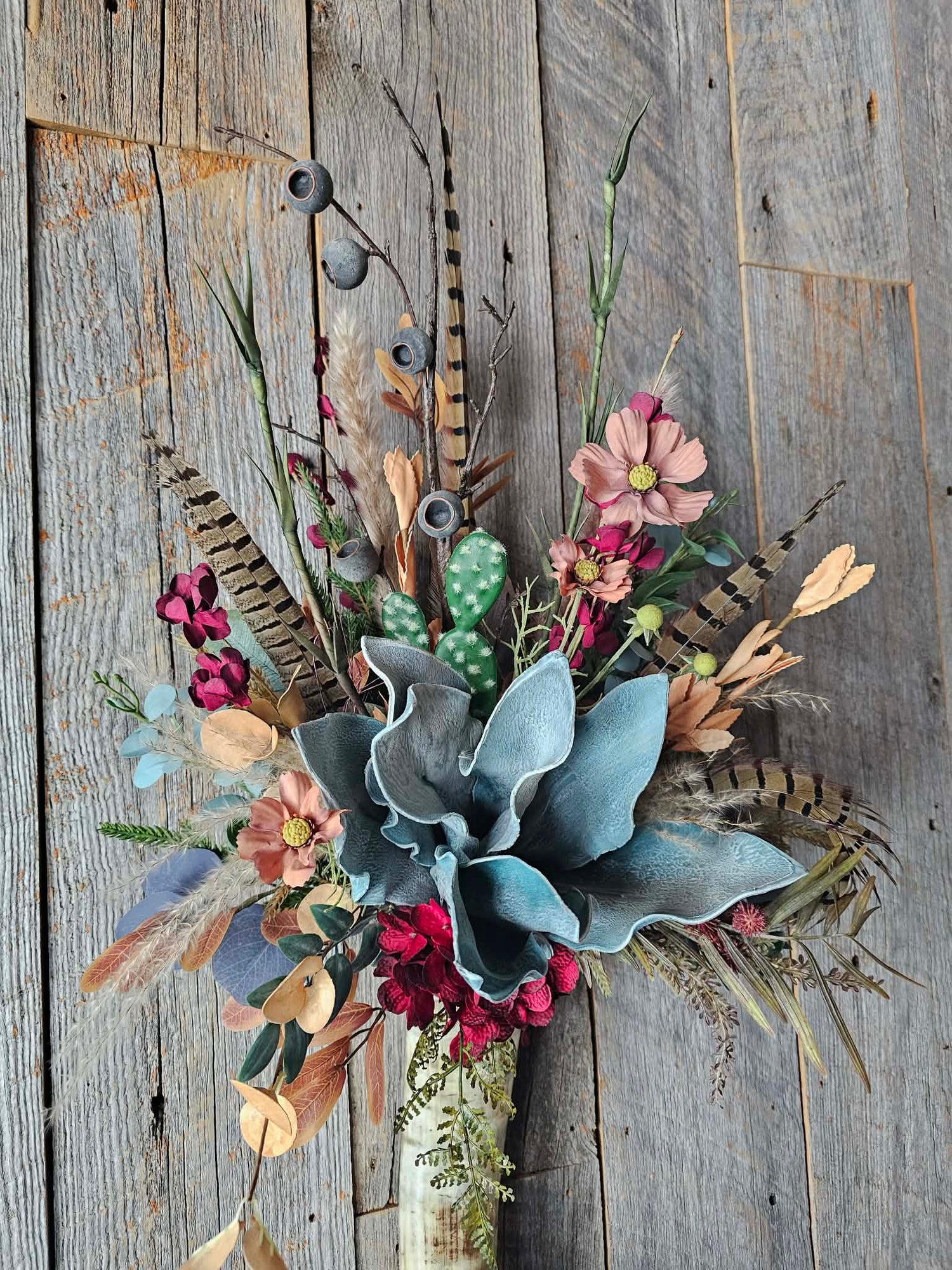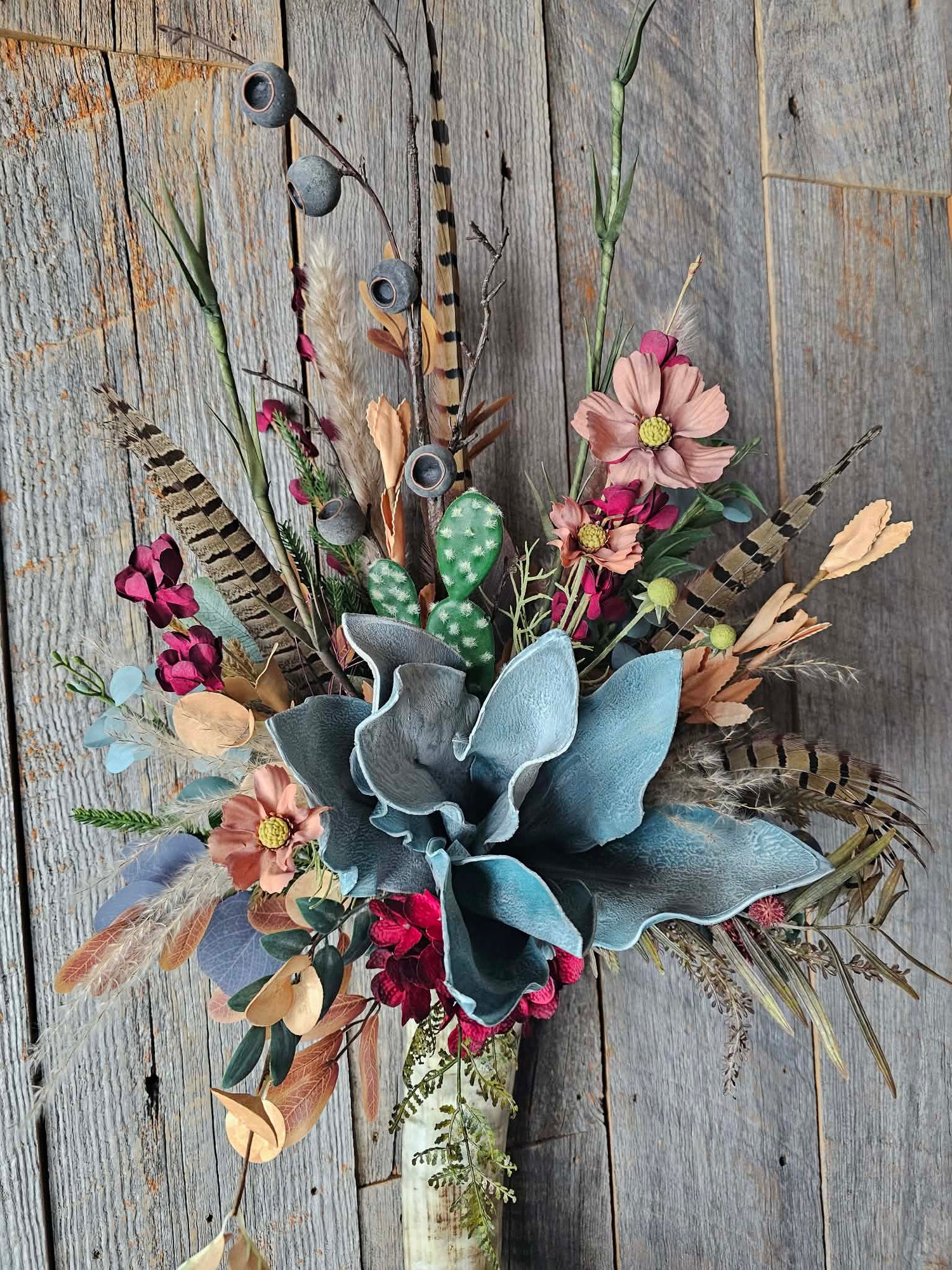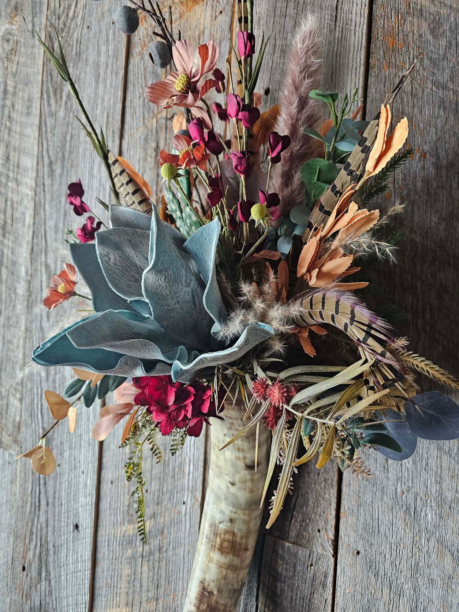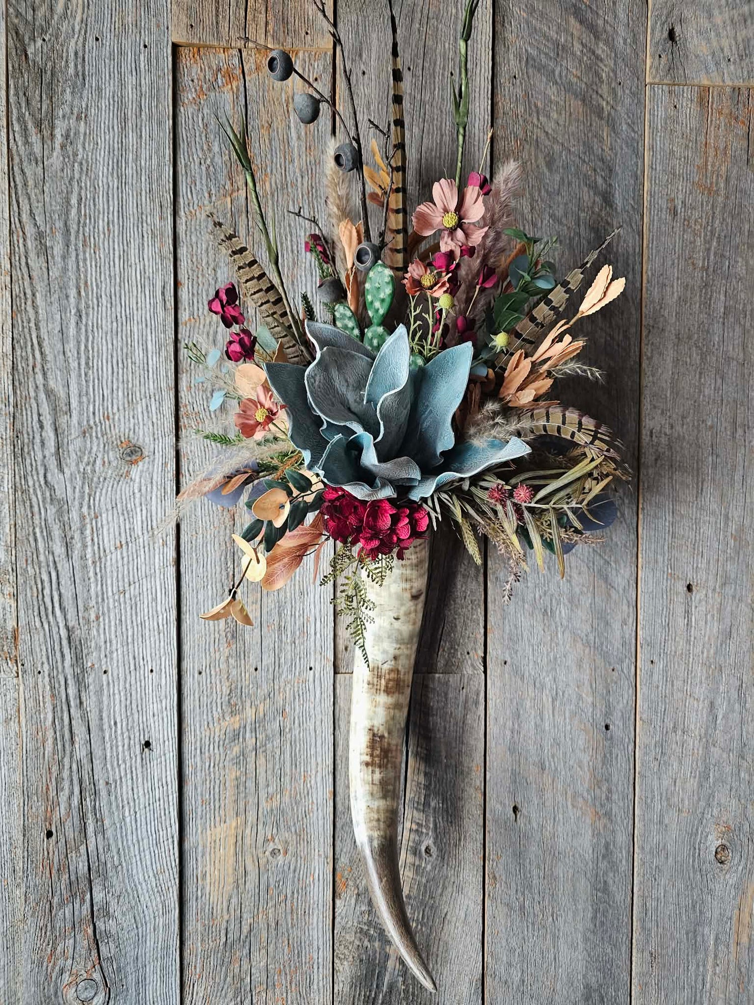 Audrey has a lighter, more playful feel with a slightly smaller horn and a beautifully layered mix of color. Cool blue-grays and soft sage set the foundation, warmed up with creamy neutrals, natural pheasant feathers, and pops of deep berry, and a subtle peachy tan.